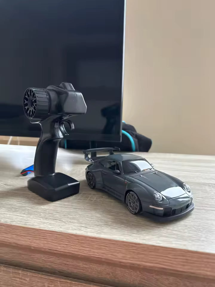 Otrzymujesz kompletny zestaw. W środku są: model RC, pilot, akumulator, ładowarka i pachołki. Hitem są dwa komplety kół: śliskie do driftu i gumowe do wyścigów.
