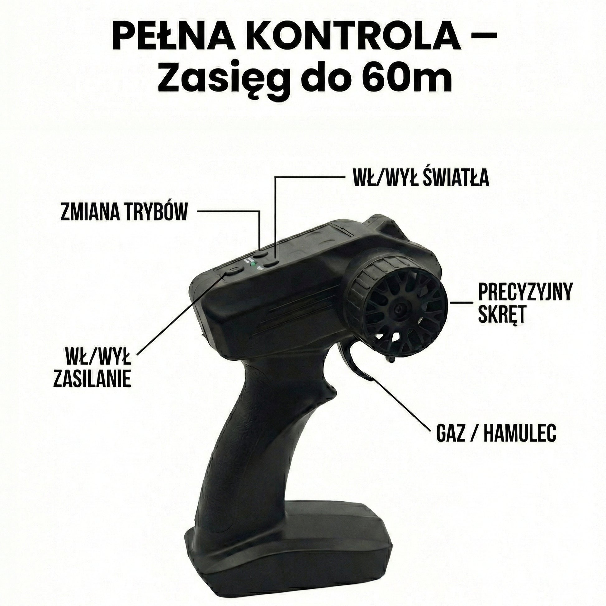 Stały napęd 4WD daje pełną kontrolę w poślizgu, a światła LED robią klimat. Dzięki wytrzymałej baterii masz aż 20 minut ciągłej jazdy na jednym ładowaniu.